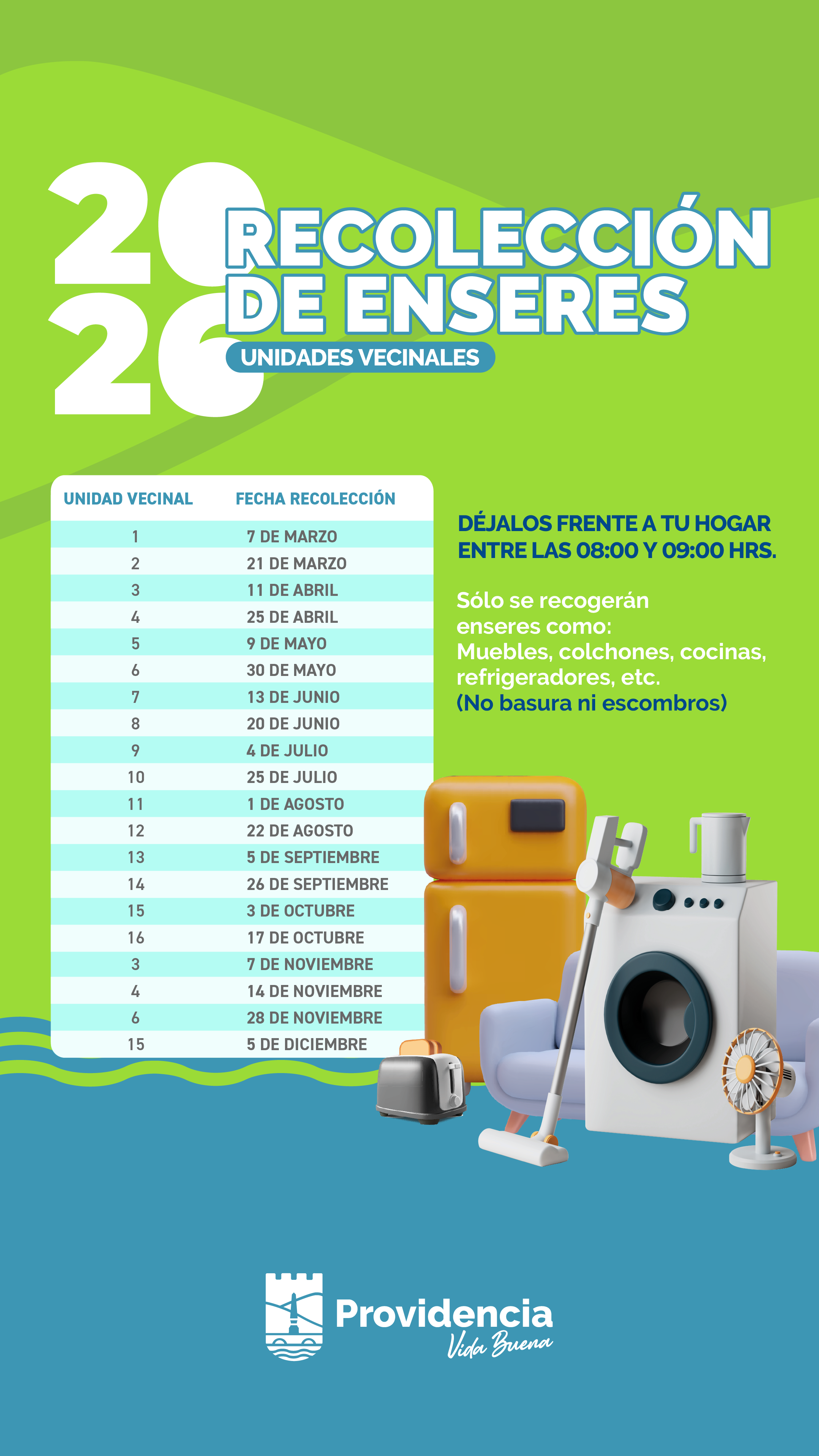 Invitamos a dejar sus enseres entre las 8:00 y las 9:00 horas en el frontis de su hogar.