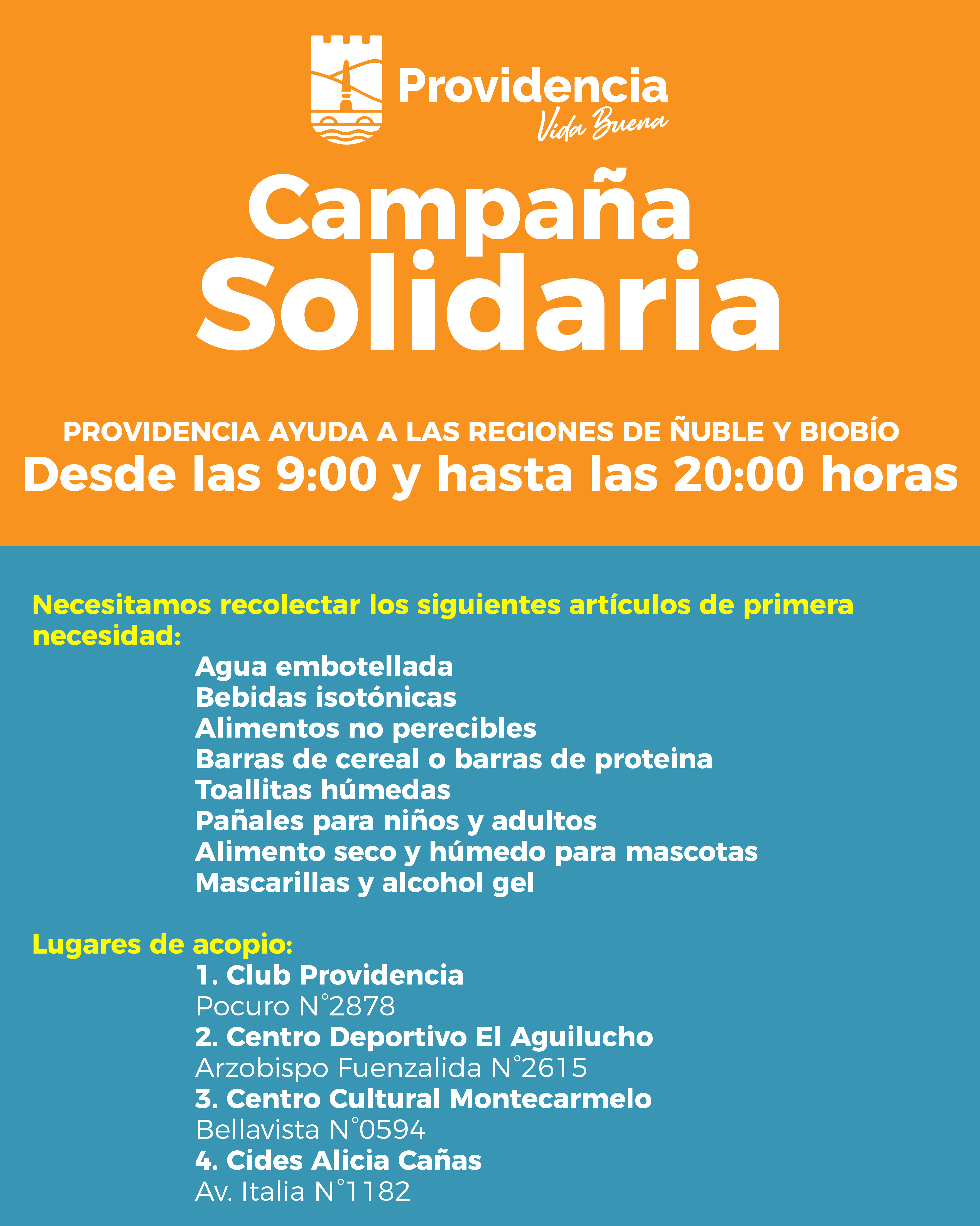 Debido a los graves incendios forestales que han afectado a las regiones de Ñuble y Biobío, la Municipalidad de Providencia ha iniciado una campaña de recolección de ayuda solidaria para los sectores afectados. Se han habilitado 2 puntos de recolección que estarán funcionando durante toda la semana hasta las 20:00 horas.